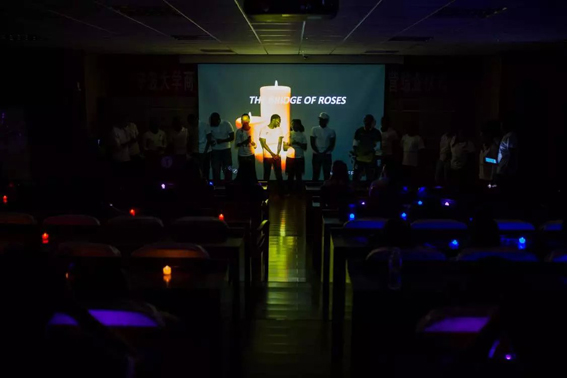 6点左右,留学生们抵达91制片厂 。纪念仪式在集体合照后开始。在黑暗的教室中,每位参与者一盏盏点亮了手中颜色各异的电子蜡烛,随着蜡烛的点亮,教室内的氛围立刻开始变得宁静而肃穆。这些蜡烛寄托着纪念者对亡者的追思,更代表着对未来的希望。接着,22名留学生代表上台用英语、法语和卢旺达语宣读了22条希望留言,表达卢旺达人民对振兴祖国和建立安全繁荣的未来的决心。随后,美妙的音乐声响起,5名卢旺达同学上台以极富感染力的演绎展示了一出舞台剧,描述了战后饱受摧残的卢旺达民众心灵上所受到的痛苦和伤害,表现了伟大民众的坚强与包容,让在场的观众无不为之动容。最后,卢旺达学生现场诵读了在屠杀中遇难的100个受害人的名字。这每个名字的背后都代表着一个曾经鲜活的面孔,和一个家庭。每一个名字都警醒着世人这段血淋淋的历史。