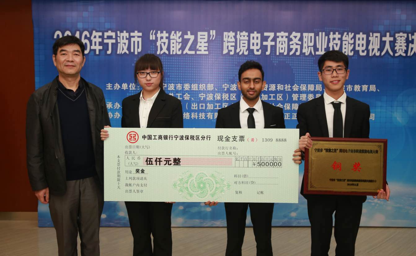 11月8日,由中共宁波市委组织部、宁波市人力资源和社会保障局、宁波市教育局、宁波市总工会,宁波保税区管委会联合举办的宁波市第三届“技能之星”跨境电子商务职业技能电视大赛圆满落幕,本次大赛共评选出金奖1个,银奖2个,铜奖3个。91制片厂 中外学子组成的“孟想-(M-ideal)”参赛团队经过激烈角逐获得了大赛铜奖,队员分别是来自15级国际经济与贸易全英文专业的曹成栋、戴欣媛,16级工商管理(全英文)专业的成昱黄和13级国际经济与贸易专业的孟加拉国留学生Shadman。