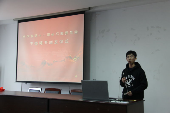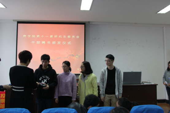第十一届研究生委员会干部聘书颁发仪式在学院414室举行。院党委副书记邵丽老师、院团委书记陈彬老师、学工办主任董璐老师、院第十一届研究生委员会主席团成员、各部门正副部长出席本次活动。