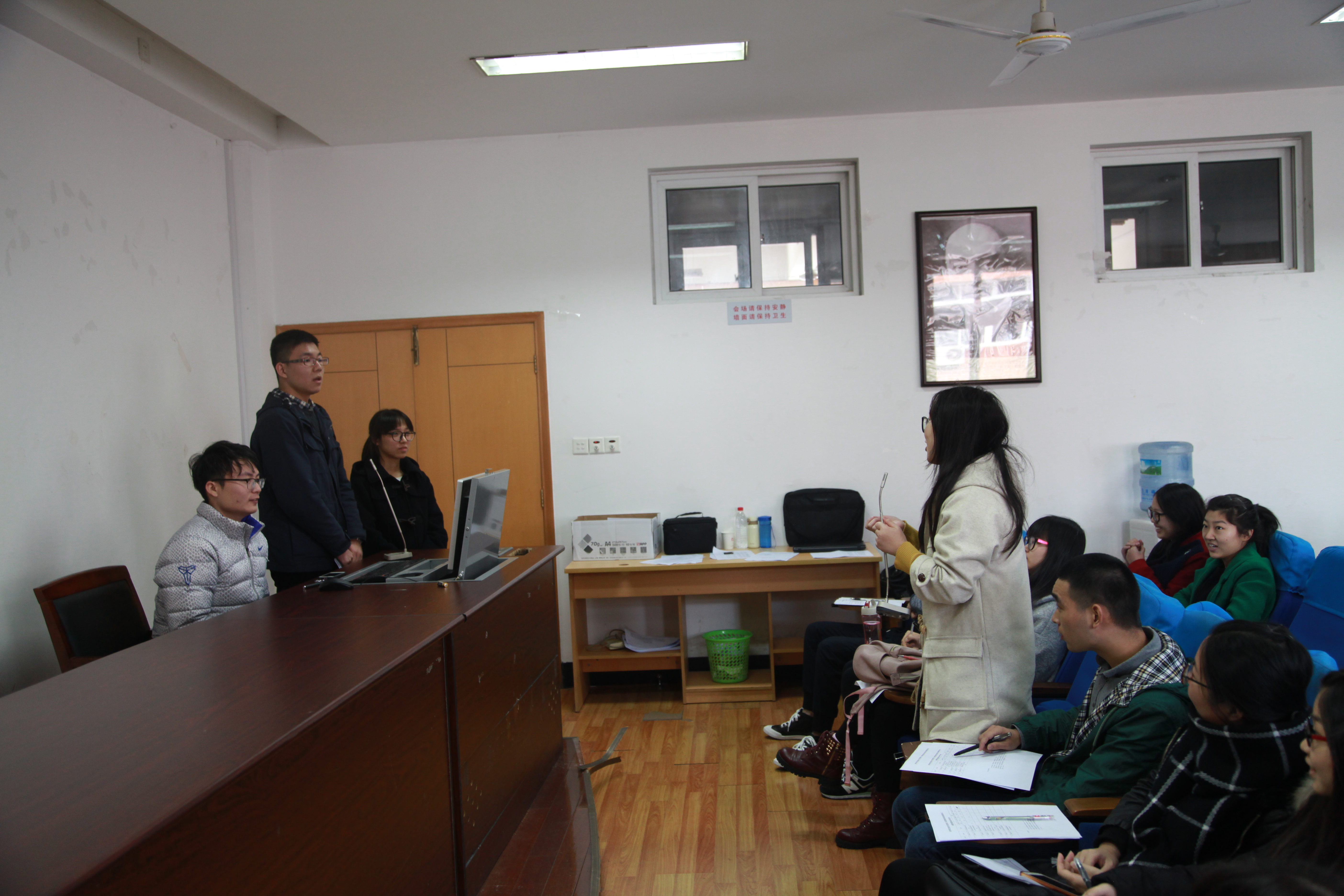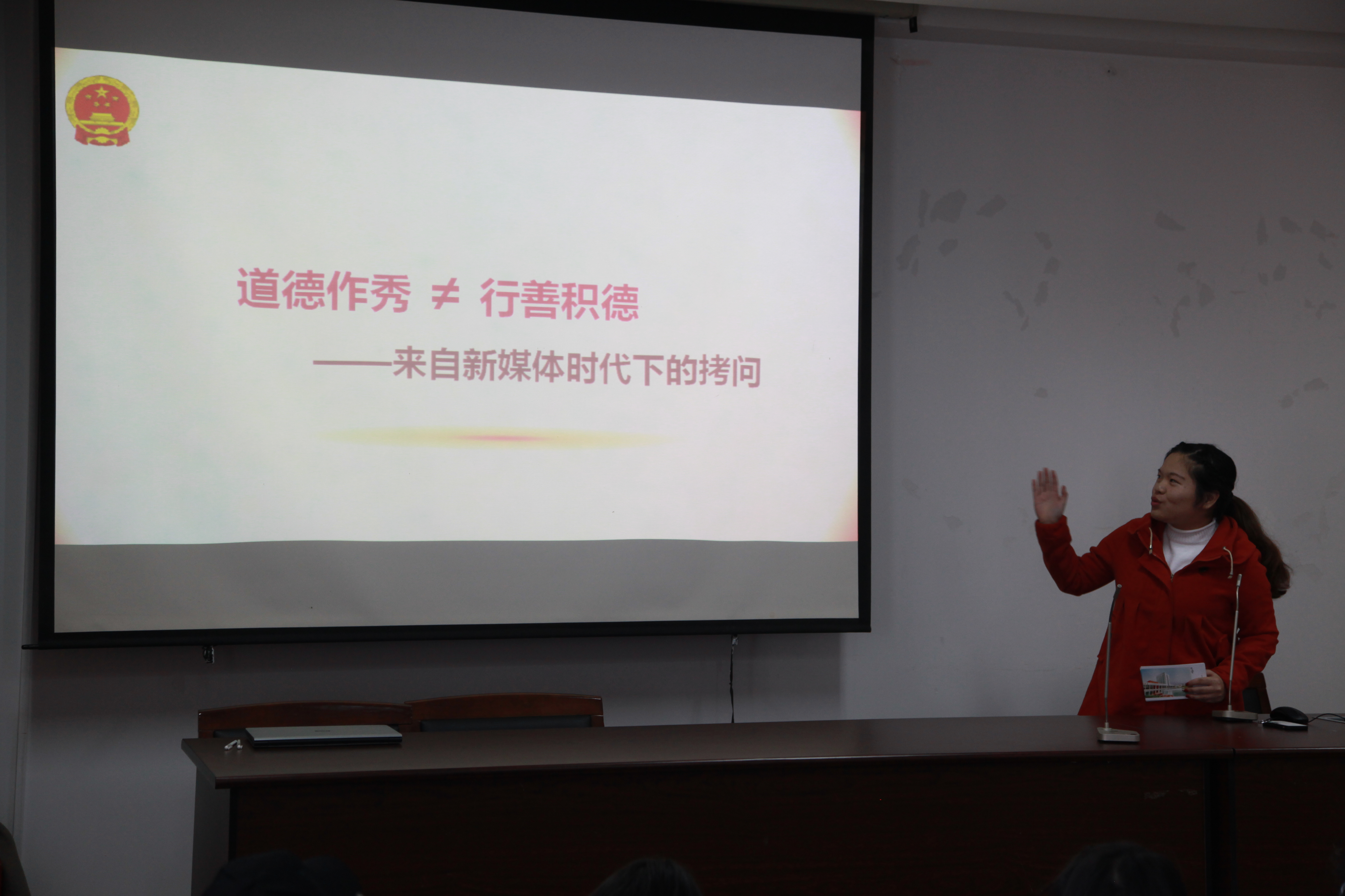 微型党课定位于价值普及、政策解读、热点引导,讲课要注重以小见大,有感而发,深入浅出,讲好师生党员担当的故事,运用多媒体提升讲课的效果,扩大微型党课覆盖面。在同学们的ppt讲解与展示中,全体学员了解了应该如何才能让自己称得上是一名好党员,反思了作为党员应起到的模范带头作用;感受了廉政建设下,躲藏在阴暗角落的腐败,认清了道德作秀的丑态,意识到真情实意献爱心的可贵;剖析了抢红包在带给人们娱乐效益的同时,暗藏着的赌博隐患;探讨了面对日益恶化的环境,我们究竟该如何协调其与经济发展之间的关系……。微型党课过程中,不断有新想法,金点子的迸发,各组同学在探讨学习中收获颇多。在提问与回答环节,则时不时会有精彩的回答,赢得观众的阵阵掌声。