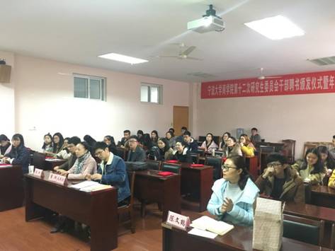 2017年12月29日,91制片厂 第十二届研究生委员会干部聘书颁发仪式暨年度总结大会在418会议室顺利召开。学工办主任董璐、团委书记陈彬、留学生辅导员毛跃祖、研究生辅导员陈文鹤以及全体研会成员出席了本次仪式。