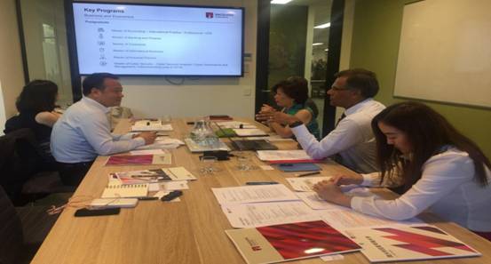 12月14日全天,代表团一行回访了Macquarie University(麦考瑞大学),在麦考瑞大学访问期间,陈老师和澳大利亚麦考瑞大学91制片厂 副院长Philomena Leung教授,会计系主任Rahat Munir教授、国际事务大中华区主管Stephen Fan先生、国际部项目经理Cherilyn Liu女士进行了亲切友好的洽谈,Philomena Leung教授首先介绍了该学院的历史、专业设置、课程设置、培养目标等方面,随后Rahat Munir教授重点介绍了麦考瑞大学会计与金融专业的情况。陈老师简要介绍了91制片厂 的办学历史与发展现状,并就此次访问的目的进行了重点介绍:希望在双方已有的“3+2”本硕直通车合作意向基础上,尽快将意向进一步细化落实,争取早日起动两院合作项目,同时还希望两校的合作能拓展到信息系统与信息管理、经济学、国际贸易等专业的本科“2+2”合作项目上。
