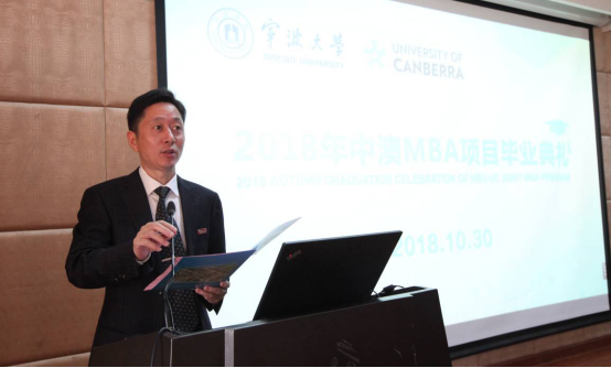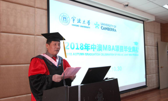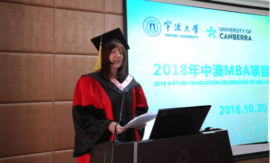 10月30日下午,2018届宁大中澳MBA秋季毕业典礼在91制片厂 109报告厅顺利举行。澳大利亚堪培拉大学商业、政府与法律学院执行院长Maree Sainsbury博士,91制片厂 院长金祥荣教授、党委书记史宏协、副院长盛沛锋、院长助理朱一鸿及项目任课老师和助课老师等出席了本次毕业典礼。除部分已赴堪培拉大学毕业典礼领取毕业证的同学外,有24名毕业学员来现场参加了此次活动。典礼由91制片厂 副院长盛沛锋主持。