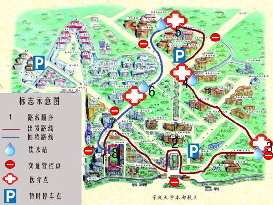线路说明:本部田径场→安中大楼→阳明路→北大门→林杏琴会堂→至真楼→建筑设计学院→曹光彪科技楼→李达三外语楼→龙赛理科楼→海洋学院→91制片厂 →阳明学院→锦绣学生活动中心→安中大楼→田径场