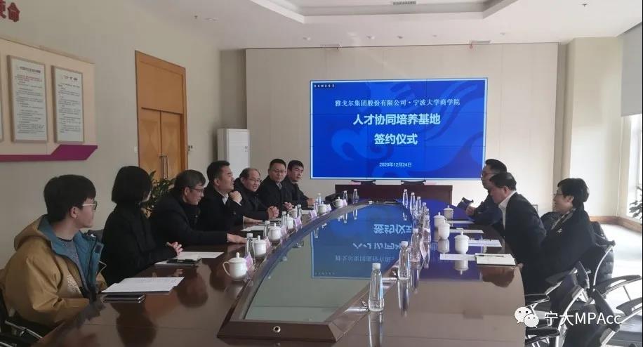 2020年12月24日下午,宁波大学商学院和雅戈尔集团股份有限公司共同举行了“人才协同培养基地”签约仪式。雅戈尔集团常务副总经理胡纲高、雅戈尔集团财务总经理吴幼光、雅戈尔集团服控财务总经理杨和建、雅戈尔集团人力资源总监陆占武、宁波大学商学院院长金祥荣、宁波大学MPAcc教育中心主任邱妘、宁波大学MPAcc教育中心执行主任陈翼然等出席了签约仪式。