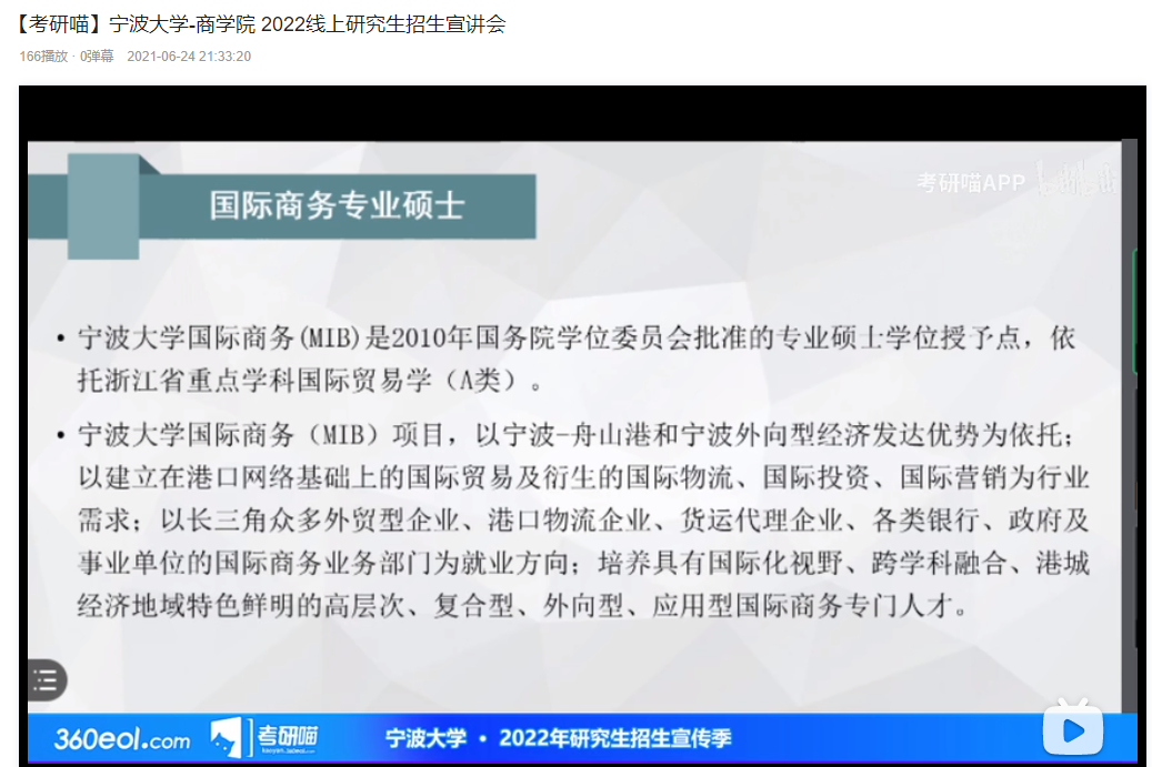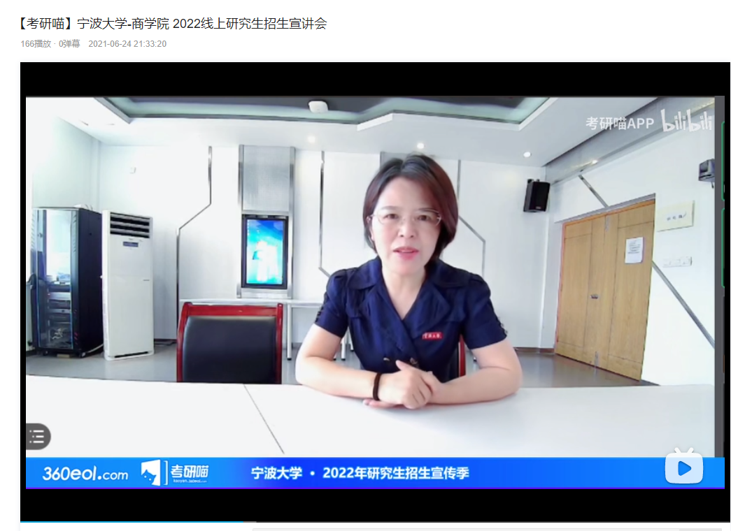 2021年6月23日,宁波大学商学院2022线上研究生招生宣讲会在bilibili线上平台举行。国际商务专业硕士学位点负责人杨丽华讲授参加了线上宣讲会,介绍了我校MIB项目的培养目标、特色及专业建设情况。