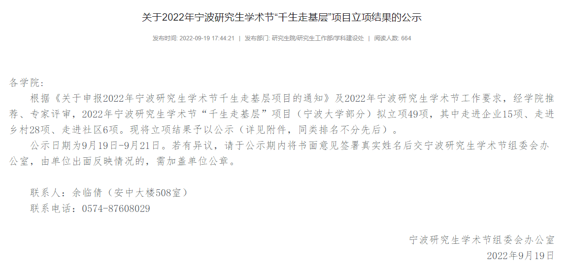 根据《关于申报2022年宁波研究生学术节千生走基层项目的通知》及2022年宁波研究生学术节工作要求,经学院推荐、专家评审,2022年宁波研究生学术节“千生走基层”项目(宁波大学部分)拟立项49项,其中走进企业15项、走进乡村28项、走进社区6项。