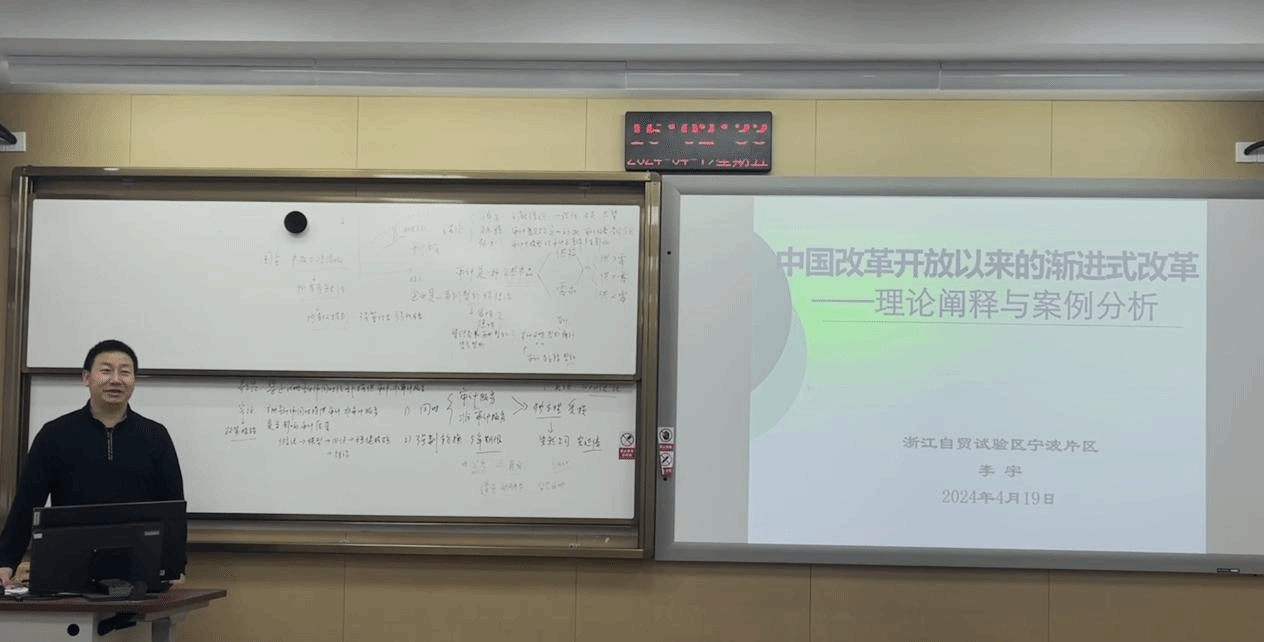 2024年4月19日下午,我校MIB《国际商务》课堂有幸邀请了宁波经济技术开发区管委会自贸区政策法规局副局长李宇为MIB学生讲解中国改革开放以来的渐进式改革,从中国改革开放的角度阐述了中国在过去的发展历程中是如何不断提升自身能力,加快步伐融入世界贸易大家庭。中国发展的奇迹不仅使得中国社会得到富强、人民生活得到提升,更重要是的中国在短短的几十年间实现了西方国家数百年才能达到的社会发展过程,这压缩的几十年对于世界来说是一个中国式奇迹。李老师先后介绍了对历史进程、改革逻辑、相关现实案例以及中国改革开放路径。