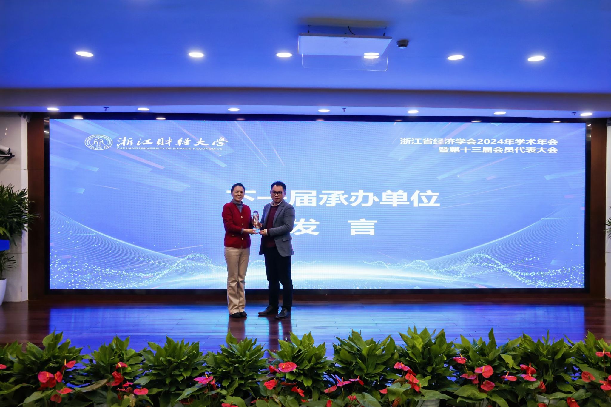 最后,学会举办了年会承办单位交接仪式,我校商学院将承办 浙江省经济学会2025年学术年会。周新苗副会长代表学院向与会代表发出了热情邀请,欢迎大家来年相聚于美丽的宁波大学!