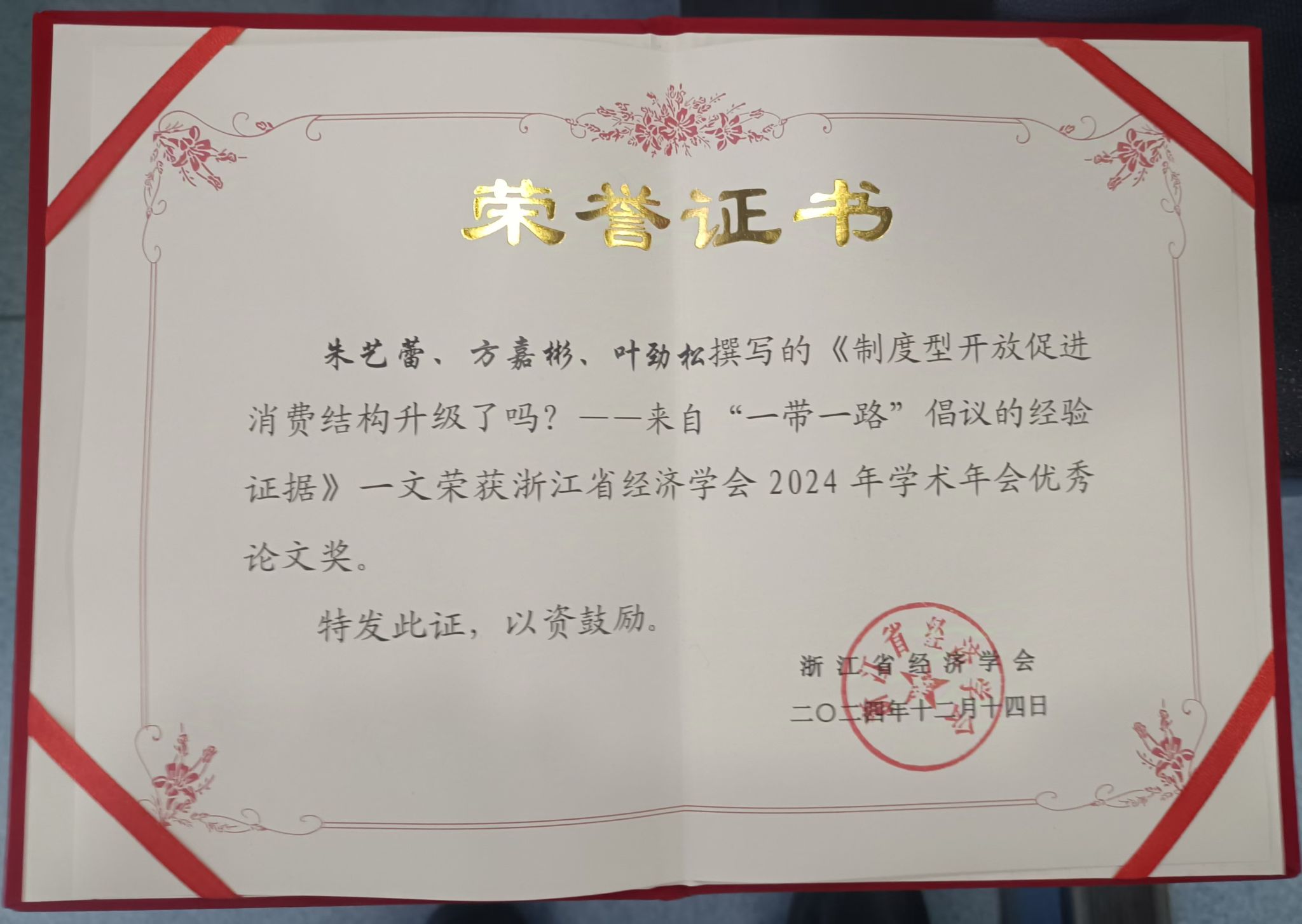 在闭幕式上,学会宣布了年度优秀成果奖和年会优秀论文获奖名单。我校MIB专职导师张梦婷副教授的专著《中国高铁对港口腹地经济一体化影响的理论与实证研究》获评年度优秀成果奖三等奖,2023级MIB研究生朱艺蕾的论文《制度型开放促进消费结构升级了吗?——来自“一带一路”倡议的经验证据》获评年会优秀论文。