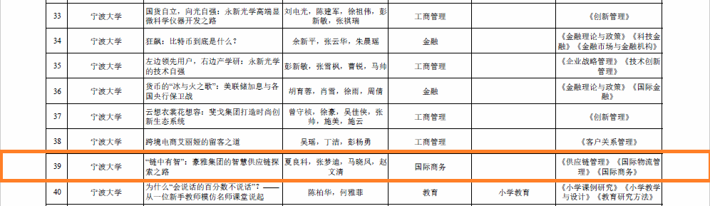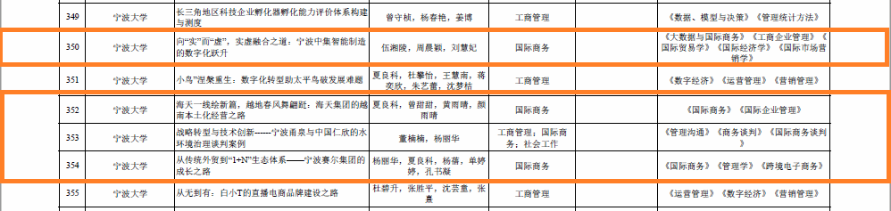此外,伍湘陵老师主持的案例《向“实”而“虚”,实虚融合之道:宁波中集智能制造的数字化跃升》(适用于《大数据与国际商务》、《工商企业管理》、《国际贸易学》、《国际经济学》和《国际市场营销学》课程)、夏良科老师主持的案例《海天一线绘新篇,越地春风舞翩跹:海天集团的越南本土化经营之路》(适用于《国际商务》和《国际企业管理》课程)、董楠楠老师主持的案例《战略转型与技术创新--宁波甬泉与中国仁欣的水环境治理谈判案例》(适用于《管理沟通》、《商务谈判》和《国际商务谈判》课程)以及杨丽华老师主持的案例《从传统外贸到“1+N”生态体系——宁波赛尔集团的成长之路》(适用于《国际商务》、《管理学》和《跨境电子商务》课程)获得申请认定。