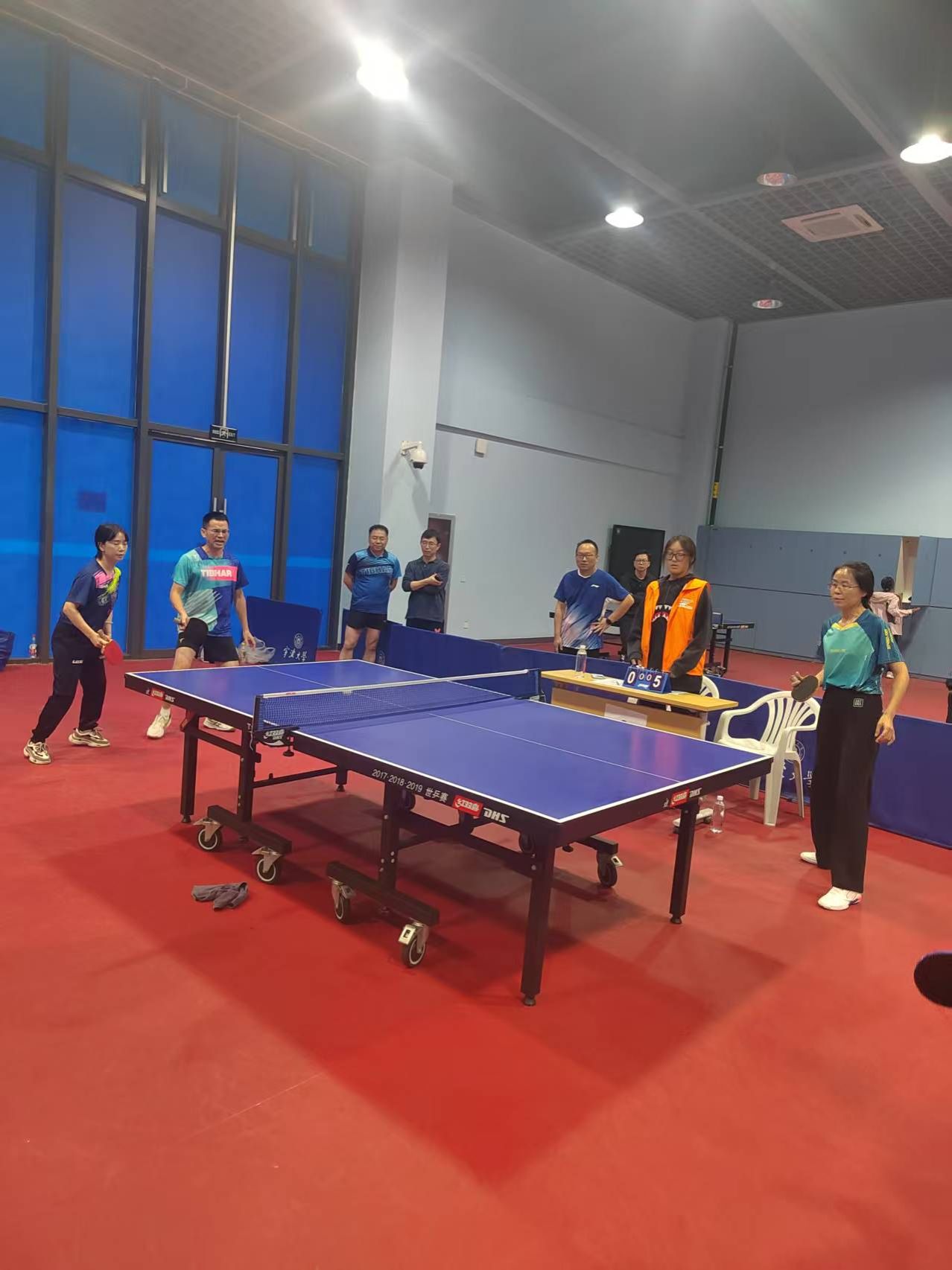 比赛当天,体育馆内掌声与欢呼声此起彼伏。上午的小组赛中,商学院代表队状态神勇,面对科技学院、后勤集团、法学院三支劲旅,均以2:0的绝对优势横扫对手,三场比赛未失一局,顺利以小组头名晋级八强。
