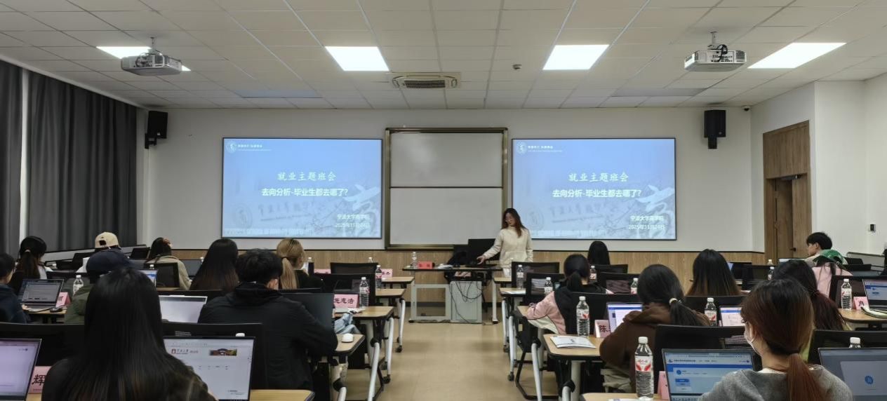 会上,马璐璐首先为同学们深度解读了两份报告的核心数据。一张张详实的图表清晰地展示了商学院近几届毕业生的职业起步动态,直观的数据也反应了毕业生高质量就业的发展路径。这些“身边的数据”为同学们勾勒出一幅真实可感的就业地图,使大家对未来的行业选择、地域流动有了更为直观和理性的认识。