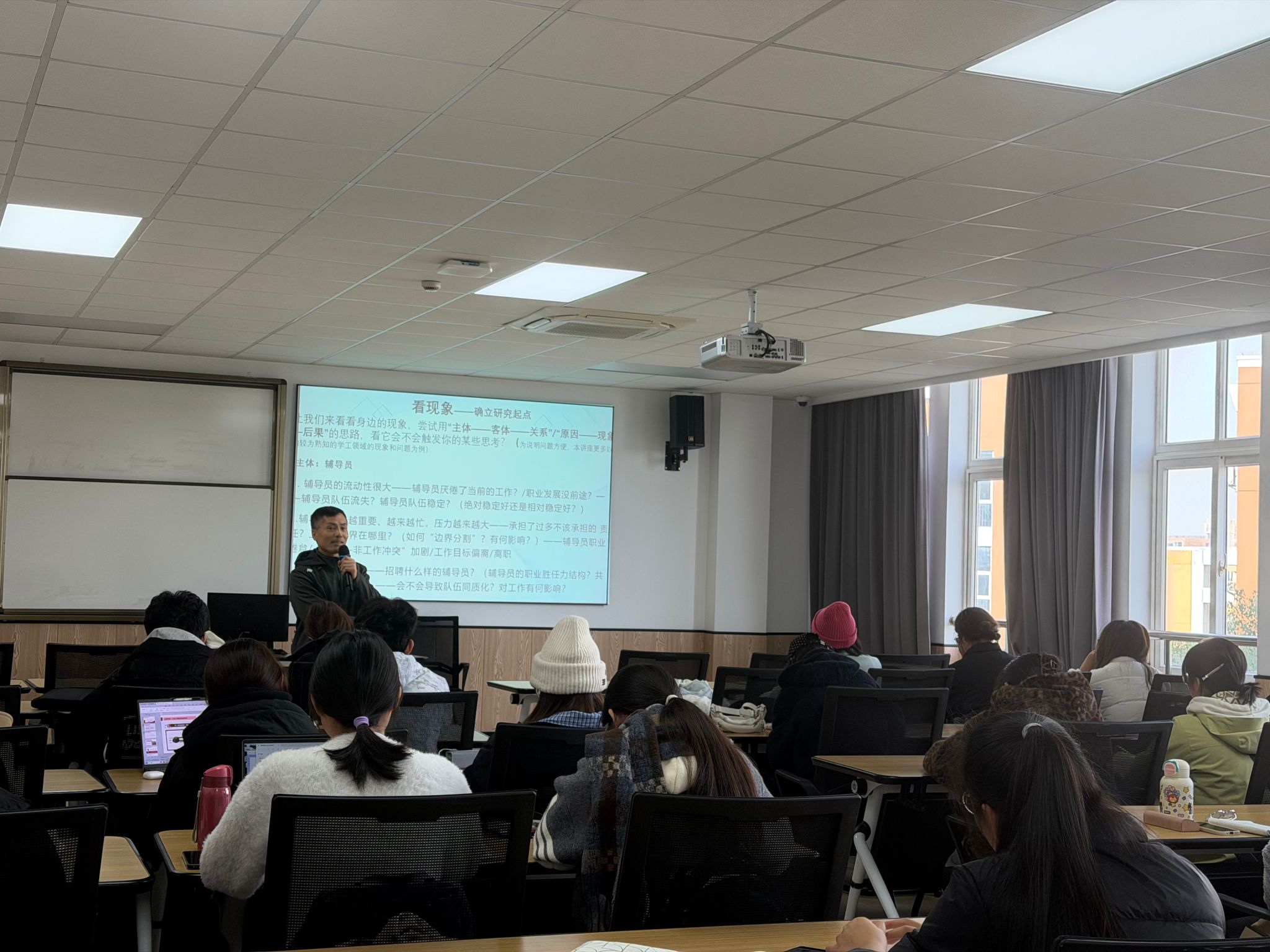 讲座中,鞠教授围绕经管类学术研究的核心命题展开,系统解答了“为什么研究”“研究什么”“如何研究”三大关键问题。在“为什么研究”部分,他指出研究目标需与个人兴趣、学业发展、职业规划相契合,目标相容方能事半功倍;在“研究什么”环节,他强调研究应立足专业领域,从学习生活、社会实践中的“真问题”出发,方能激发内在兴趣。针对“如何研究”这一核心内容,鞠教授通过“研究环”理论,详细拆解了从现象观察、个案探寻、因素分析,到概念提炼、文献研读、理论支撑,再到视角转换、问题聚焦、变量设定、逻辑构建的完整学术化过程。此外,他还结合辅导员职业倦怠、贫困生就业困境、大学生网络沉迷等贴近学生生活的案例,生动阐释了极限思维、多维视角、假设挑战等研究技巧。