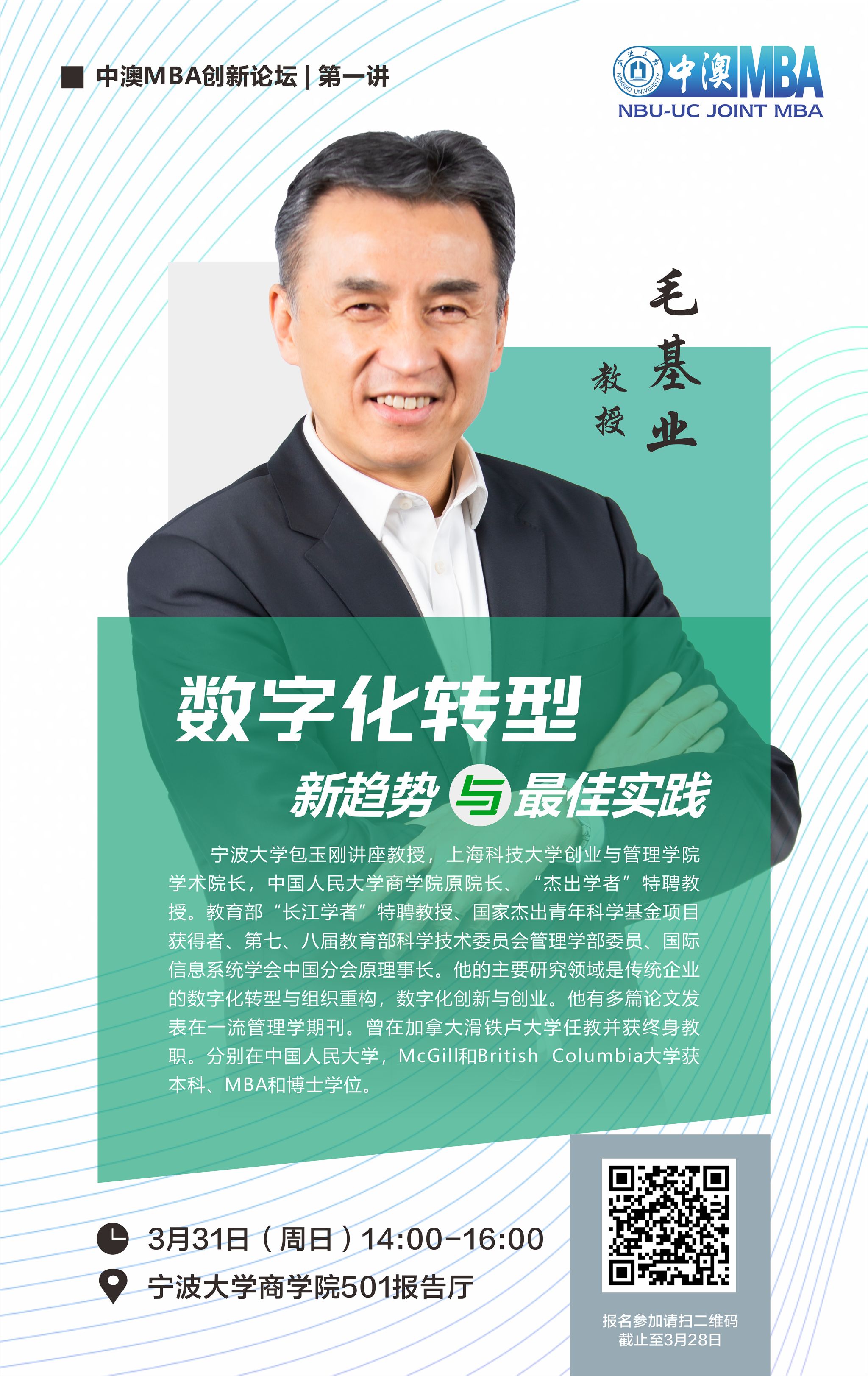 为进一步提升中澳MBA项目教学育人质量,促进校友与学校的交流互动,中澳MBA项目特邀请宁波大学包玉刚讲座教授毛基业教授来院进行题为《数字化转型新趋势与最佳实践》的讲座,开启中澳MBA创新论坛讲座系列|第一讲的序幕。欢迎广大师生校友积极参加!