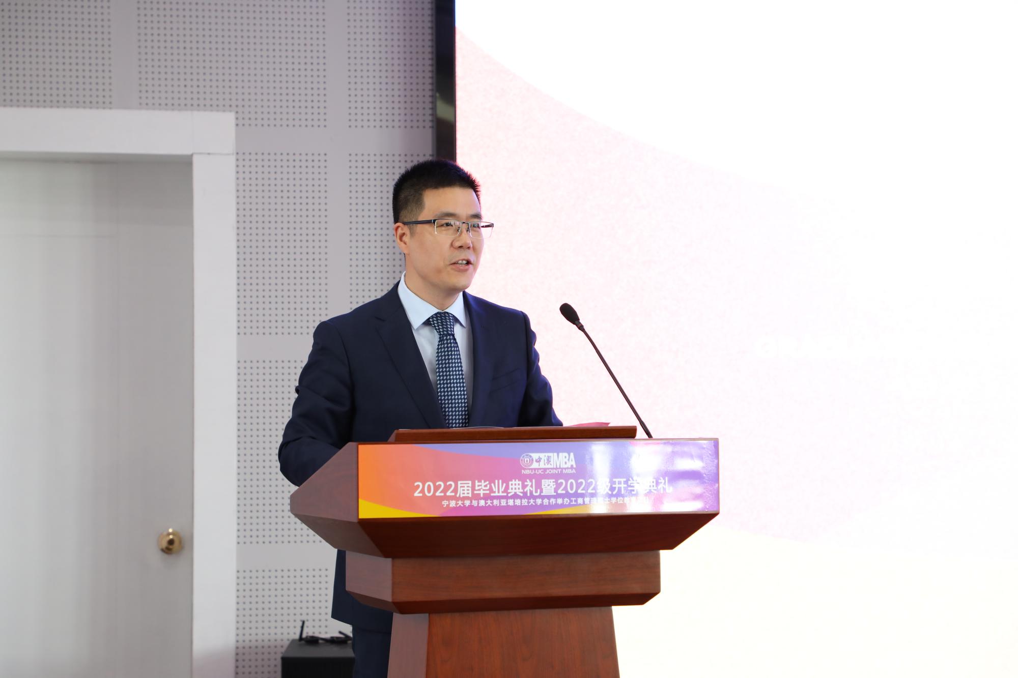 在澳大利亚堪培拉大学的毕业典礼现场视频播放后,金院长首先致辞。他祝贺同学们顺利完成学业,感谢老师们的辛勤付出,也感谢社会各界对宁波大学中澳MBA发展的支持。他指出中澳MBA项目应该及时顺应社会发展变化趋势,定位高质量发展培养体系,培养更多“有创新思维,懂资本运营”的人才;同时,他还提出“大学MBA”教育应通过学生自主“批判式”学习,敢于挑战教科书中的权威理论观点,增加同任课教师的课堂互动,“敢问问题”、“会问问题”,来有效提升课堂的教学质量,增加学习的探索性和研究性;第三点,他提出项目要进一步提高游学活动质量。“读万卷书,行万里路”。培养学者和有思想的人,“行万里路”是非常重要的。金院长通过分享他暑期的游学经历,倡导MBA学员们要不断丰富自身的思想体系,训练悟性,激发灵感,为明天步向成功做好准备。