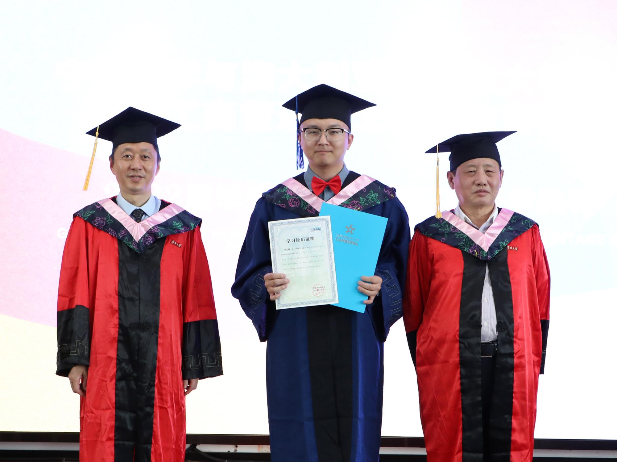 接着,学院党委书记史宏协宣布2022届毕业生名单,院长和书记分别为毕业生颁发了澳大利亚堪培拉大学的工商管理硕士学位证书和宁波大学商学院学习经历证明。