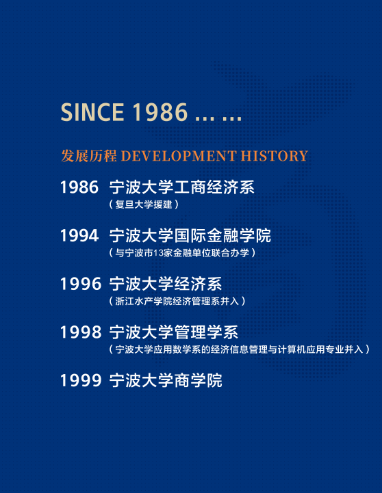 商学院创建于1986年,是宁波大学创立最早和办学规模最大的学科性学院,先后经历了工商经济系(1986年)、国际金融学院(1994年),于1999年更名为商学院。