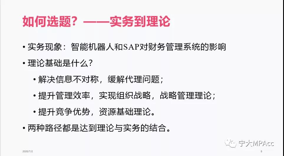 2020年8月16日上午9:00,由宁波大学商学院会计专硕教育中心主办的主题为《MPAcc论文开题与写作指导》的讲座顺利召开,本次讲座很荣幸地邀请到了上海财经大学会计学院王悦副教授作为主讲嘉宾,由我院会计专硕执行主任陈翼然老师主持,因疫情原因,本次会议采用腾讯会议平台进行直播,会计专硕50余名师生参与此次讲座。