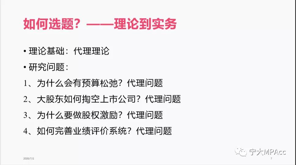 紧接着,王悦老师谈到,要想确定一个好的选题,第一步需要确定研究领域,这样可以帮助同学们更清楚地了解选题所涉及的理论基础。第二步是要确定研究主题,对于研究主题的确定,王悦老师给出了五个思路,分别是:主题陈旧但角度新颖;主题与时俱进;由大样本研究出发进行选题;利用实地调研获取研究机会以及借鉴他人主题、更换研究主体等,并对每一个思路都结合示例给出了详细的点评,使同学们更为直观地体会到如何进行选题。