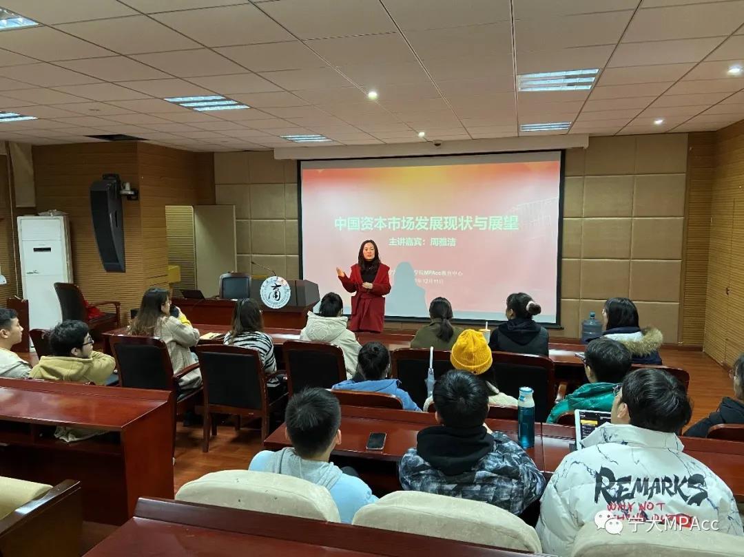 2020年12月11日下午7:30,由宁波大学商学院会计专硕(MPAcc)教育中心主办的主题为《中国资本市场发展现状与展望》的讲座顺利召开。本次讲座邀请到复星星元副总裁、复星创富董事总经理周雅洁女士作为主讲嘉宾,周雅洁紧密围绕中国资本市场的现状与展望主题结合自己的实际工作进行了精彩的分享。讲座由会计专硕执行主任陈翼然老师主持,讲座吸引了全日制会计专硕以及会计学本科的数十名同学参与。