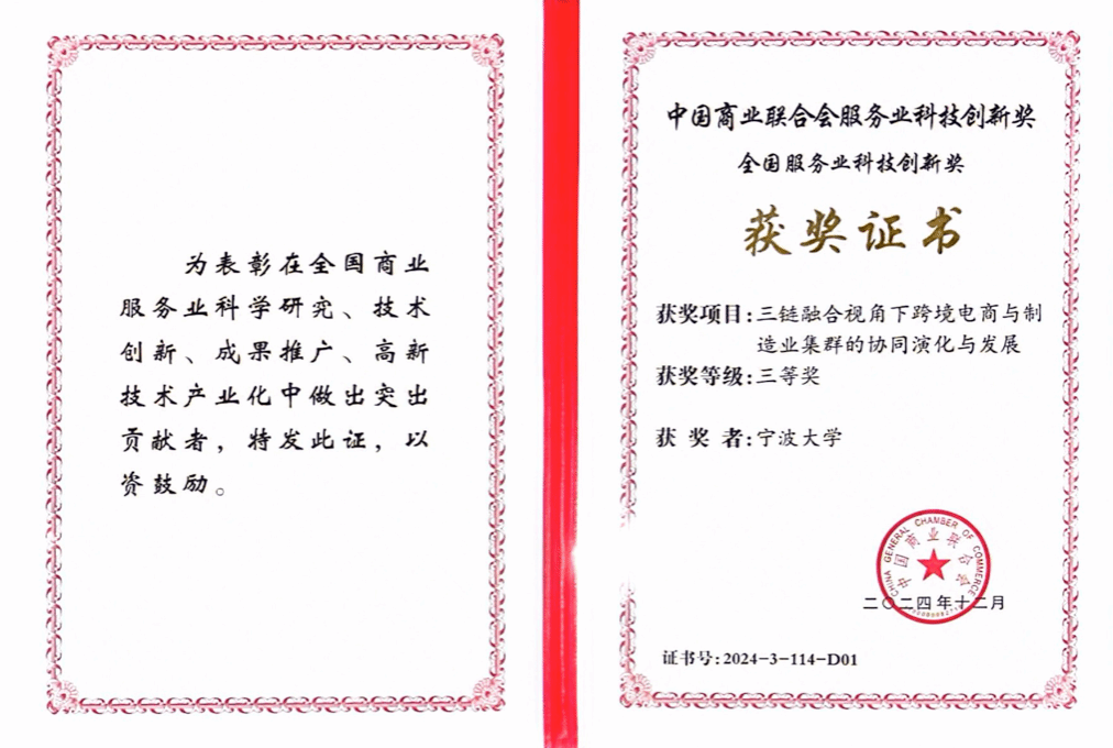2025年7月20日,中国商业联合会主办的2025年全国商业科技质量大会在北京友谊宾馆召开。大会为“以科技创新引领新质生产力发展”为主题。我校MIB学位点负责人杨丽华教授的研究成果《三链融合视角下跨境电商与制造业集群的协同演化与发展》,获中国商业联合会服务业科技创新奖全国服务业科技创新奖三等奖。