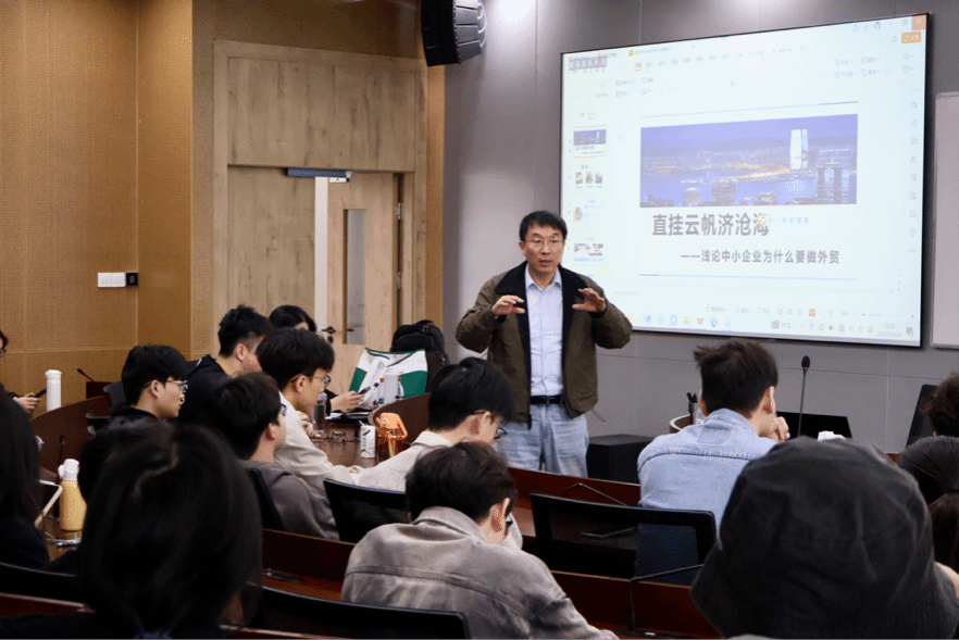 2025年10月24日上午,宁波大学商学院MIB教育中心特邀校外导师傅雨来走进《国际贸易政策与实务》课堂,为MIB学子带来了一场主题为“直挂云帆济沧海——我们为什么要做外贸”的精彩讲座。讲座在商学院525教室举行,MIB学位点负责人杨丽华教授主持,国际商务专业2025级全体研究生参加。
