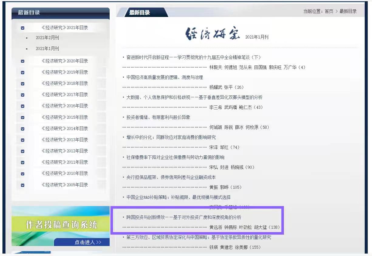 日前《经济研究》公布了2021年第1期和第2期的论文目录,我校MIB专业导师黄远浙、钟昌标、叶劲松的论文《跨国投资与创新绩效——基于对外投资广度和深度视角的分析》在《经济研究》2021年第1期发表。