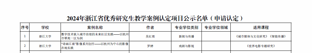 2024年10月,根据《浙江省优秀研究生教学案例认定试行办法》(浙研教字第〔2023〕08号)文件精神,按照公平、公正、公开的基本原则,浙江省研究生教育学会组织开展了2024年浙江省优秀研究生教学案例认定工作。按照评选办法,经过个人申报、培养单位推荐、形式审查等程序,共选出818项2024年浙江省优秀研究生教学案例,其中直接认定120项,申请认定698项。