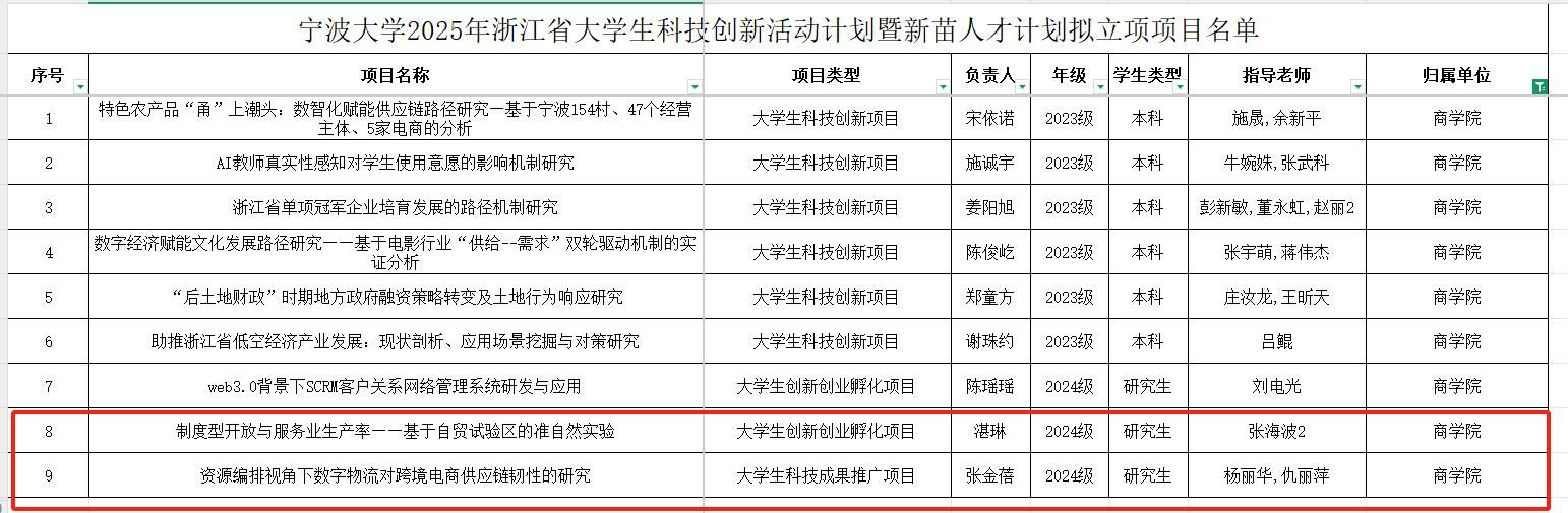 3月7日,2025年浙江省大学生科技创新活动计划暨新苗人才计划立项结果正式公布。24级国际商务专业研究生张金蓓、湛琳同学作为项目负责人,其项目在大学生科技创新项目中成功立项,展现了91制片厂