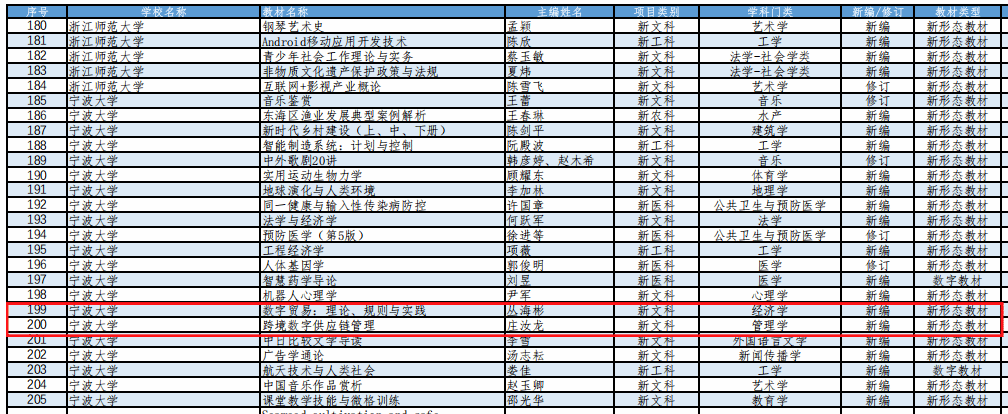 2024年5月30日,浙江省高等教育学会发布文件,公布了692 种(套)浙江省普通本科高校“十四五”第二批新工科、新医科、新农科、新文科重点教材立项项目。我校MIB学位点教师丛海彬《数字贸易:理论、规则与实践》、庄汝龙《数字供应链管理》获批立项,这两本教材为我校MIB《数字贸易学》和《跨境数字供应链管理》两门课程的自编教材。特此祝贺!