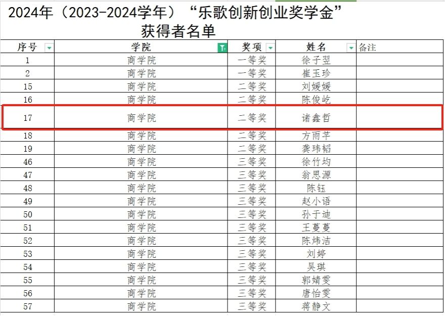近日,商学院2023-2024学年校“乐歌创新创业奖学金”获得者名单公布,国际商务2022级硕士诸鑫哲荣获“乐歌创新创业奖学金”二等奖。