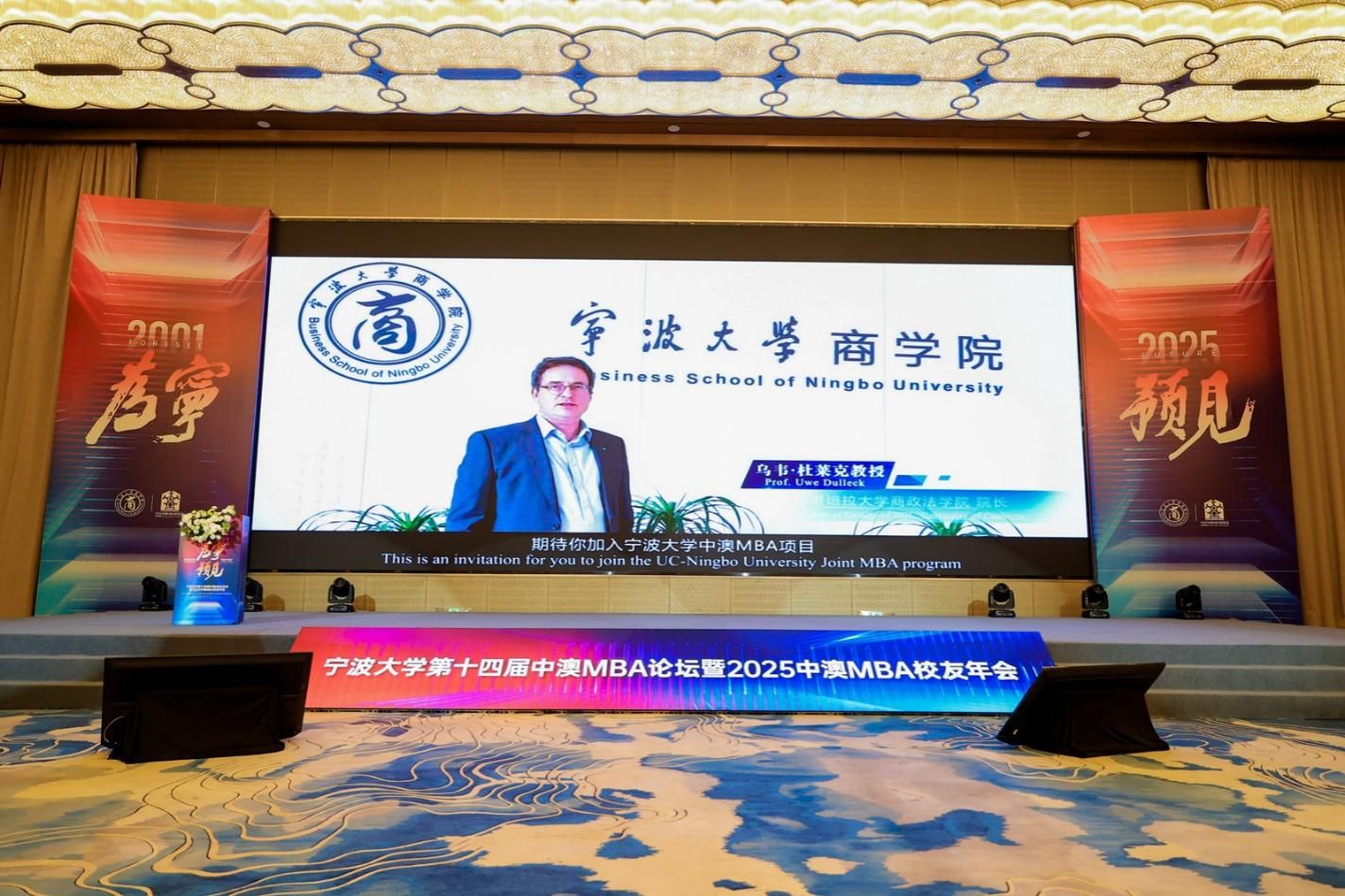 在这一重要时刻,中澳MBA项目合作方澳大利亚堪培拉大学商政法学院执行院长Uwe Dulleck教授也通过视频发来祝贺。他高度赞扬了宁波大学与堪培拉大学之间长期而成功的合作关系。宁波大学与澳大利亚堪培拉大学合作举办的中澳MBA项目至今已成功运行25年,已成为双方最具代表性的国际合作项目之一。该项目以实践教育为核心,依托堪培拉大学在毕业生职业发展方面的突出优势,致力于培养具有国际视野的商业人才。多年来,项目已培育出众多活跃在各行各业的优秀校友,形成了具有广泛影响力的中澳MBA校友网络。最后,Uwe院长呼吁更多社会精英加入宁波大学中澳MBA项目,希望能在堪培拉未来的毕业典礼上迎接更多的新生力量!