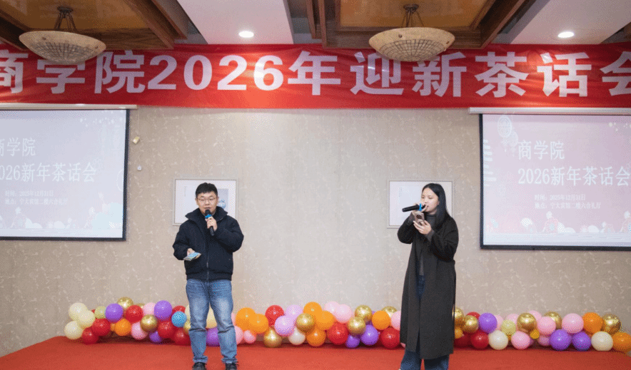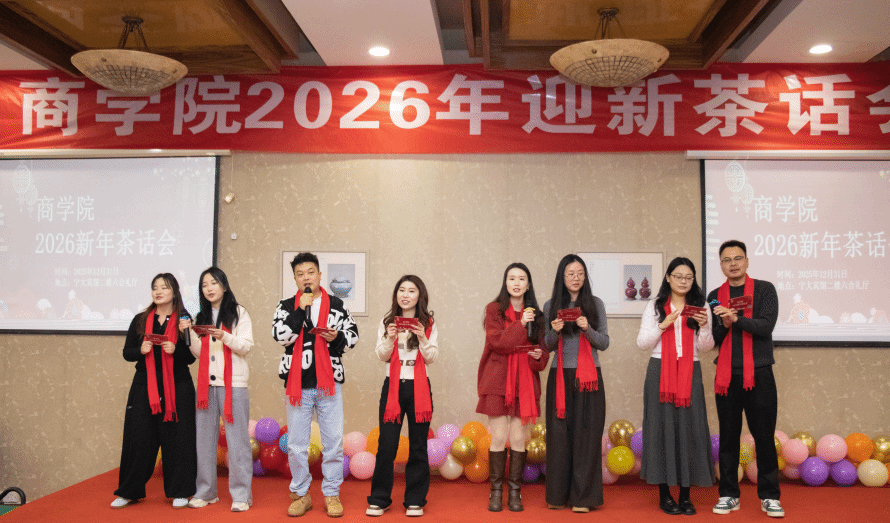为进一步增强商学院全体教职工的凝聚力与协同力,营造团结奋进的良好氛围,2025年12月31日下午,商学院工会于宁大宾馆六合礼会议室精心筹备并举办2026新年茶话会。活动现场张灯结彩、喜气洋洋,学院全体领导班子成员、全院教职工齐聚一堂。大家在温馨欢乐的氛围中,一同回顾过去一年的奋斗历程,共同展望新一年的发展蓝图,携手迎接新年的到来。