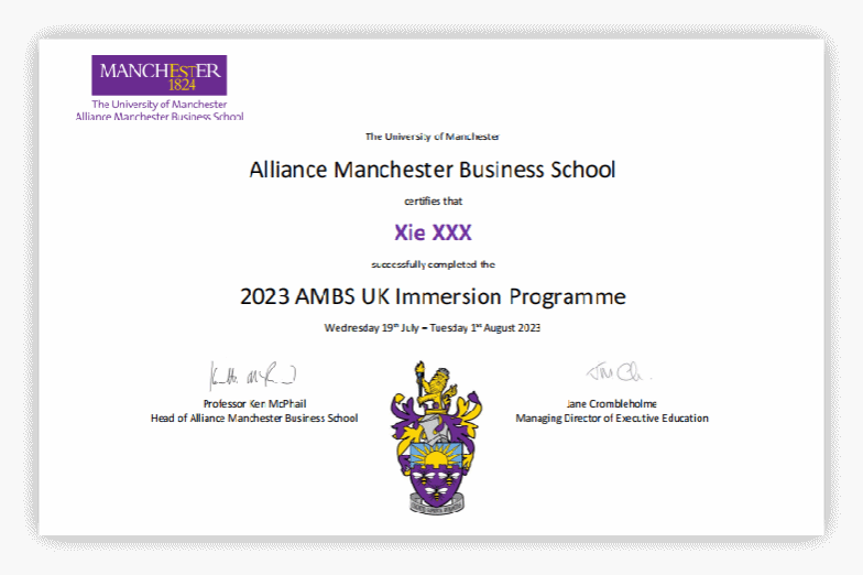 可获得曼切斯特大学商学院提供的官方成绩单与项目证书,表现优异的学生更有机会获得来自曼大商学院教授撰写的推荐信,高含金量的证明将助力学生未来的学业及职业发展。