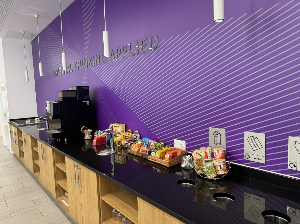 图为曼大商学院第一天注册材料,舒适的教学环境,教室外每日提供免费自助的水果、咖啡、茶、小食等供学生选择。