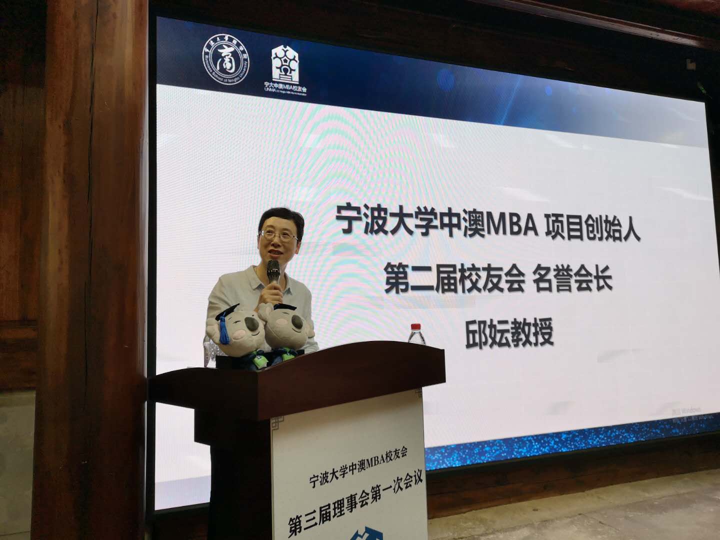 接下来,中澳MBA项目创始人邱妘教授发表讲话。她回眸起当年与澳方签订中澳MBA项目合作协议的瞬间,谈及项目二十年来的发展与变化,心情激动。她由衷祝贺校友会的工作已交棒至第三届理事,感谢校友会的工作与付出,更指出校友会的工作与校友们日常经营企业一样,需要韧劲与坚持。同时,她也提到,项目的发展与茁壮背后凝结着组织管理者、教学团队和众多校友们的努力和对项目品牌的共同维护。她衷心祝愿中澳MBA项目能持续在众人的关注、支持和口碑维护下发展得越来越好。