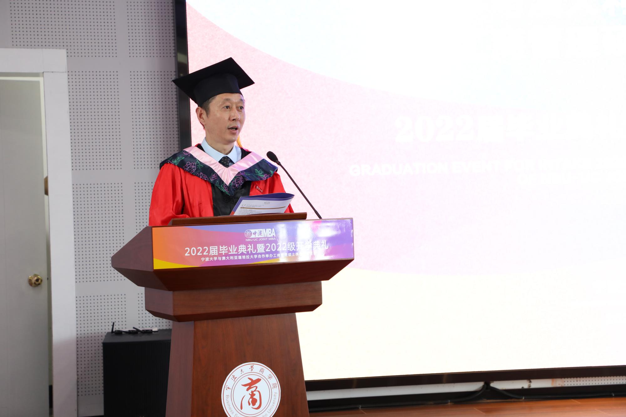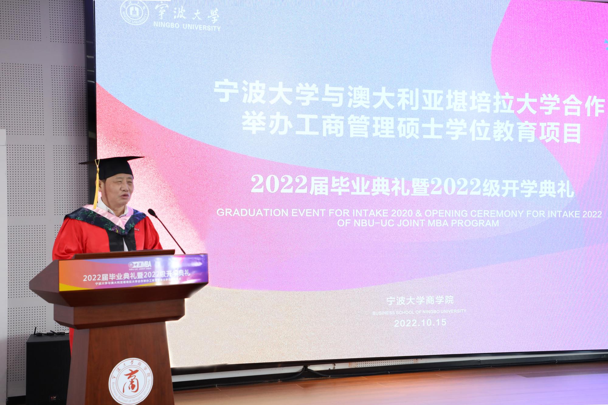 在澳大利亚堪培拉大学的毕业典礼现场视频播放后,金院长首先致辞。他祝贺同学们顺利完成学业,感谢老师们的辛勤付出,也感谢社会各界对宁波大学中澳MBA发展的支持。他指出中澳MBA项目应该及时顺应社会发展变化趋势,定位高质量发展培养体系,培养更多“有创新思维,懂资本运营”的人才;同时,他还提出“大学MBA”教育应通过学生自主“批判式”学习,敢于挑战教科书中的权威理论观点,增加同任课教师的课堂互动,“敢问问题”、“会问问题”,来有效提升课堂的教学质量,增加学习的探索性和研究性;第三点,他提出项目要进一步提高游学活动质量。“读万卷书,行万里路”。培养学者和有思想的人,“行万里路”是非常重要的。金院长通过分享他暑期的游学经历,倡导MBA学员们要不断丰富自身的思想体系,训练悟性,激发灵感,为明天步向成功做好准备。